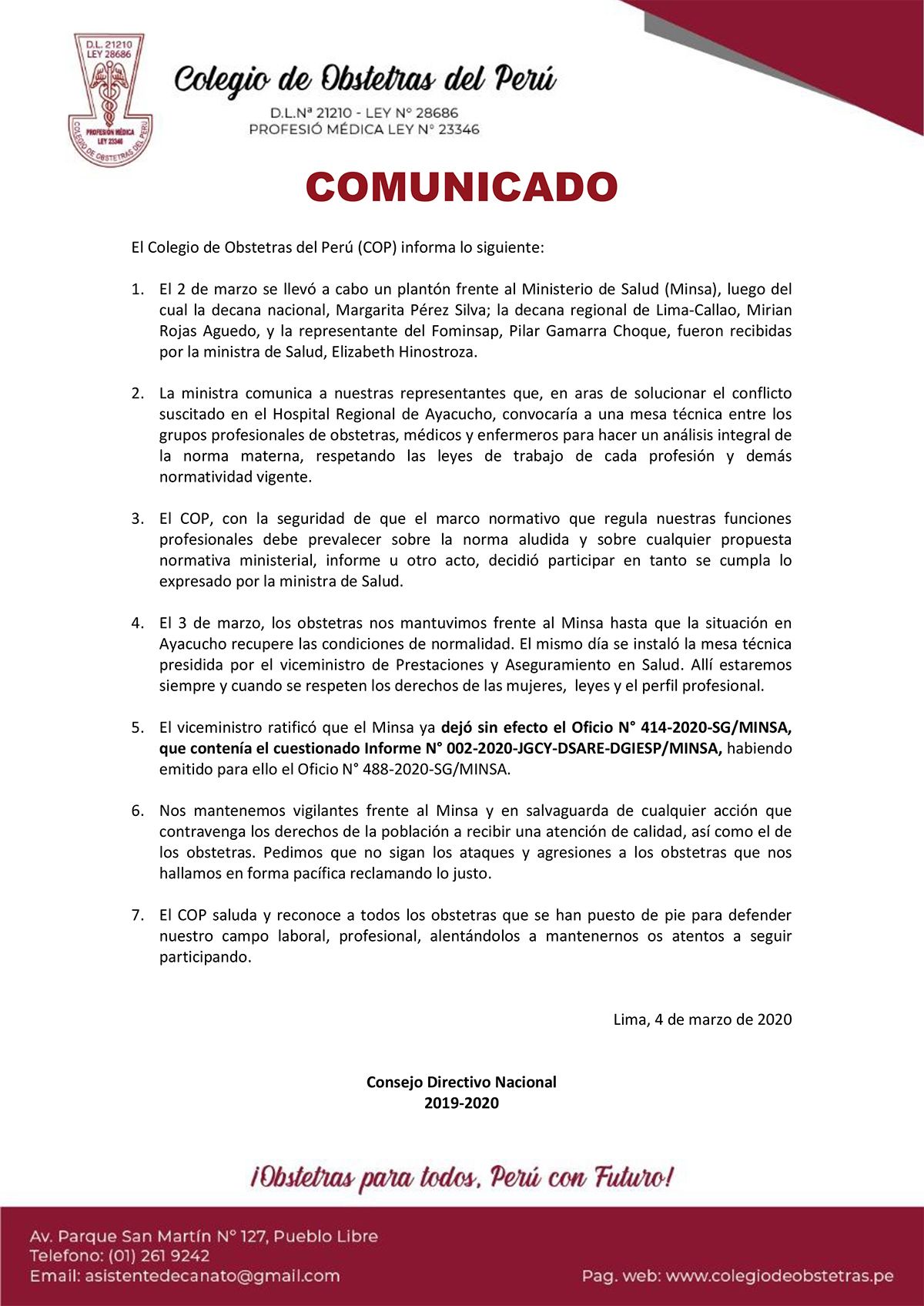 04 DE MARZO DE 2020 By Colegio De Obstetras Del PerúIn Colegio de Obstetras del Perú, Comunicado, NoticiasPosted 4 marzo, 2020 Descargar PDF Descargar PDF