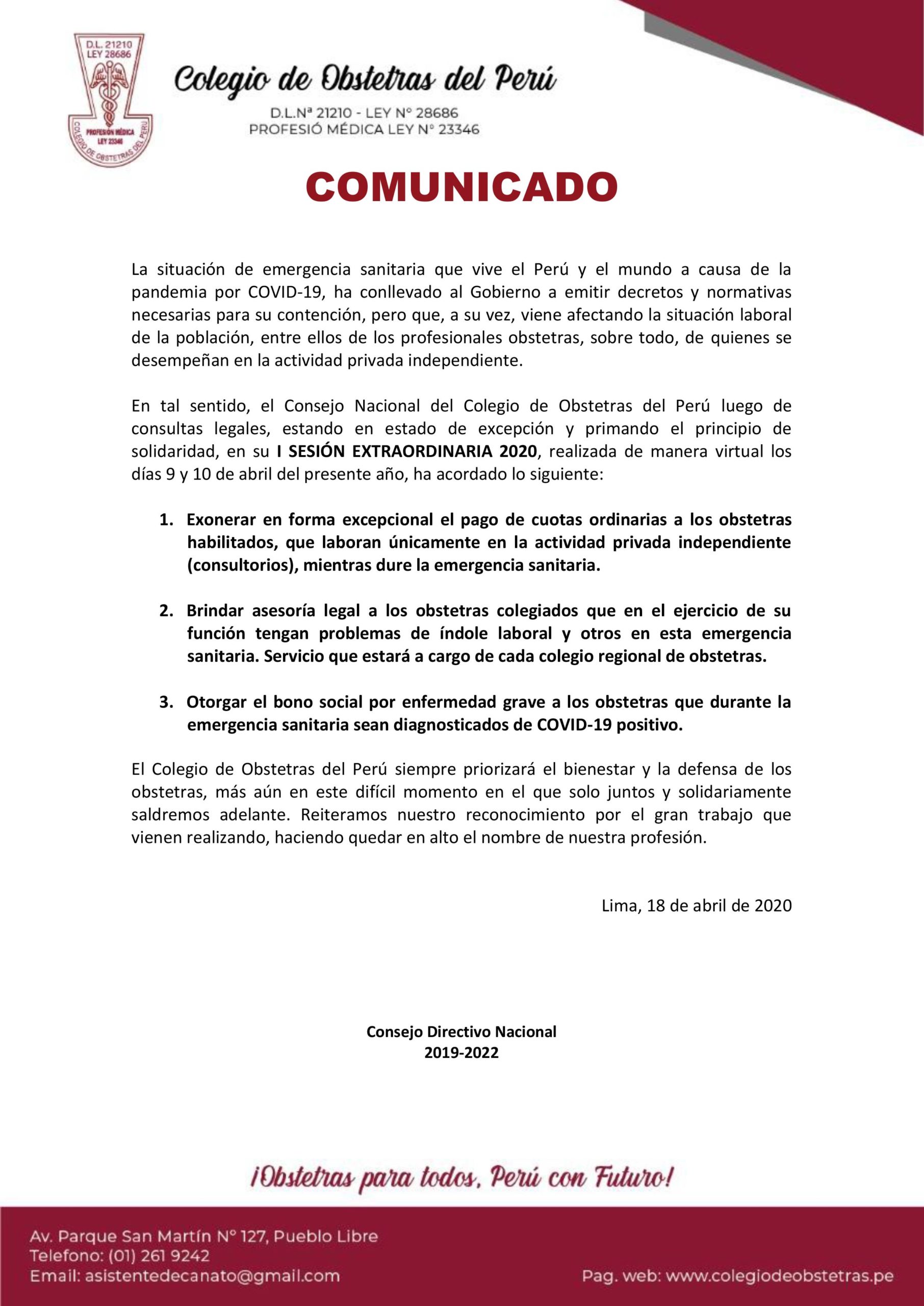 CONSEJO NACIONAL DEL COP ACUERDA BENEFICIOS PARA OBSTETRAS By Colegio De Obstetras Del PerúIn Comunicado, NoticiasPosted 18 abril, 20200 Comment(s) Descargar PDF