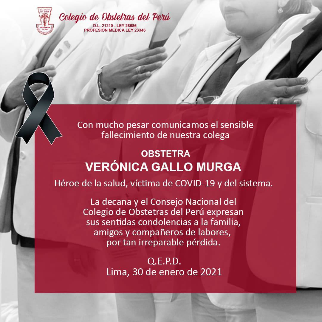 Lamentamos comunicar el sensible fallecimiento de la obstetra Verónica Gallo Murga, quien era docente de obstetricia en la universidad Telesup, en Lima.