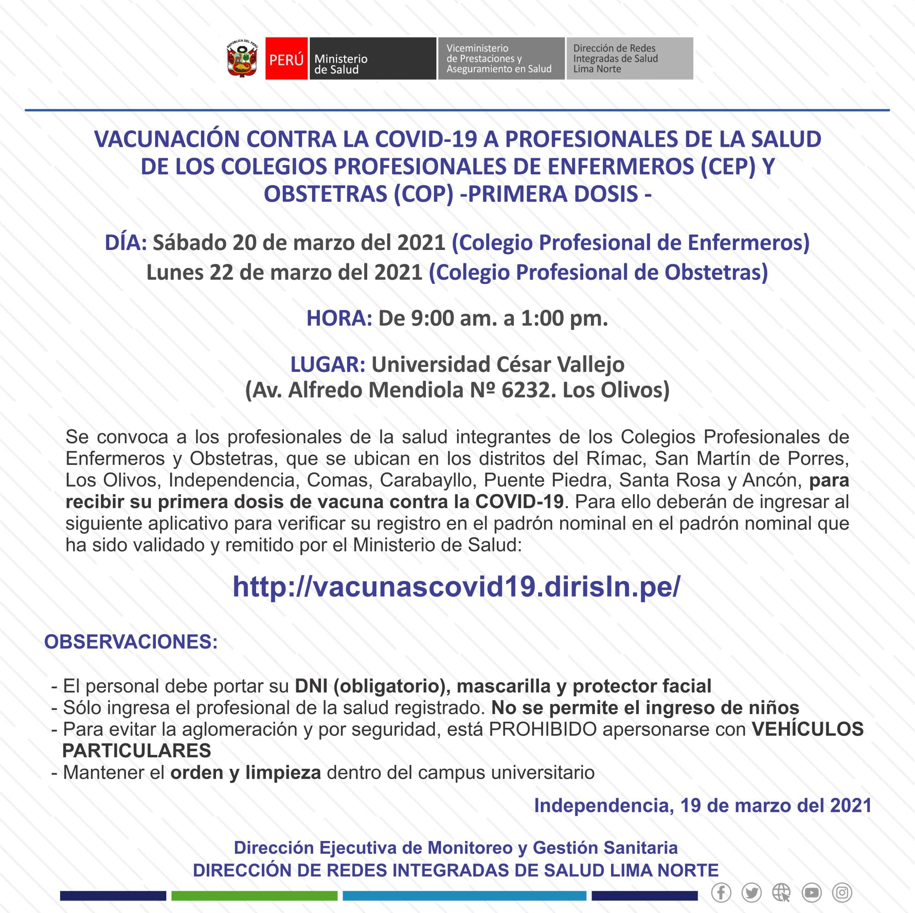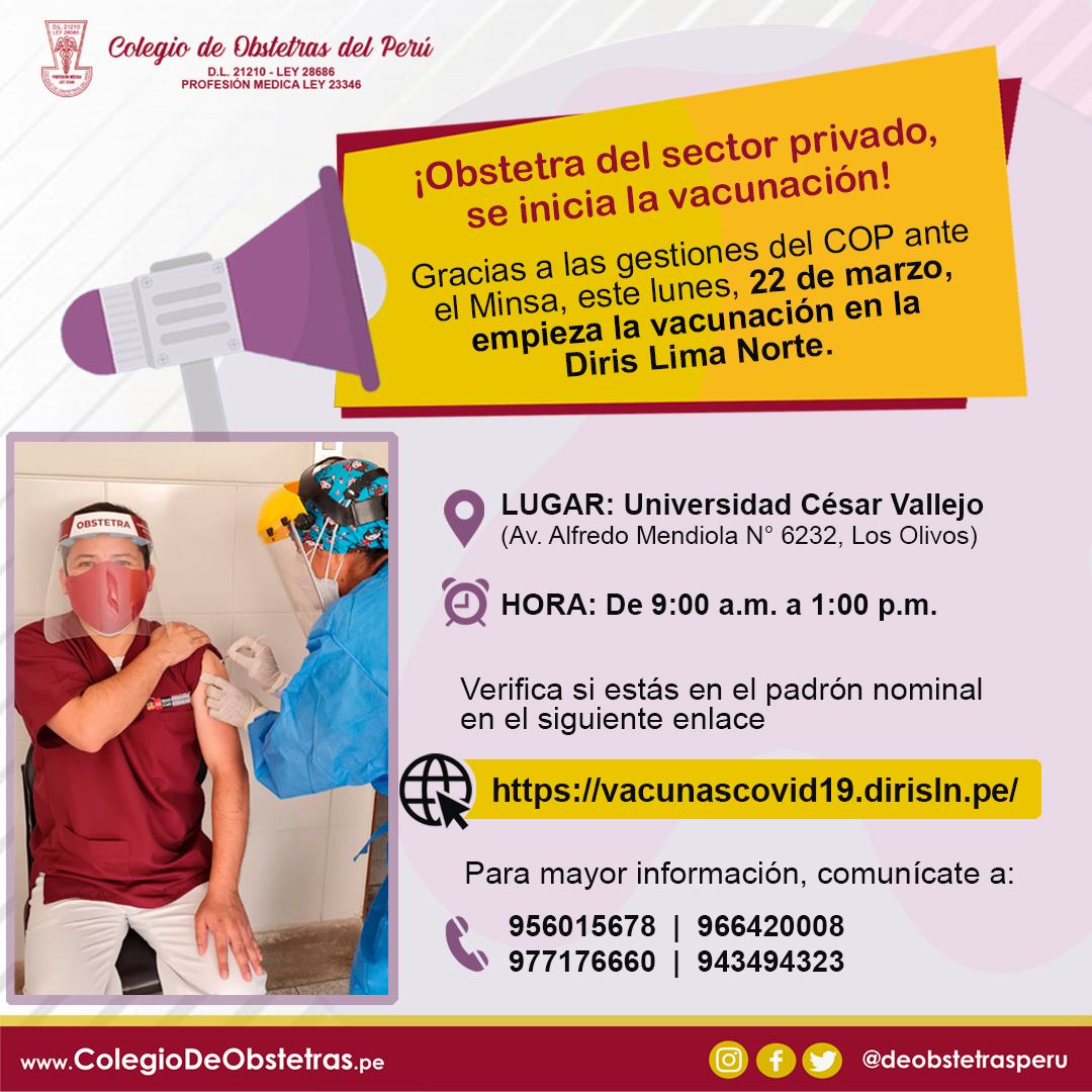 Obstetras del sector privado, luego de muchas gestiones ante el Minsa, hemos logrado que se establezca el padrón nominal con la data enviada por el Colegio de Obstetras del Perú y se inicie la vacunación en la Diris Lima Norte, el lunes, 22 de marzo.