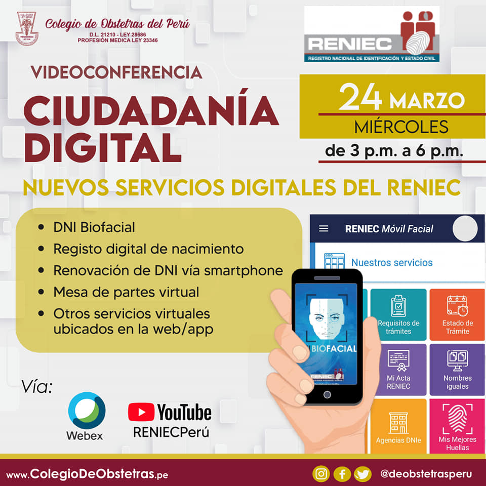 El Colegio de Obstetras del Perú y el Reniec te invitan a participar en la videoconferencia «Ciudadanía digital: nuevos servicios digitales del Reniec», dirigida a obstetras.
