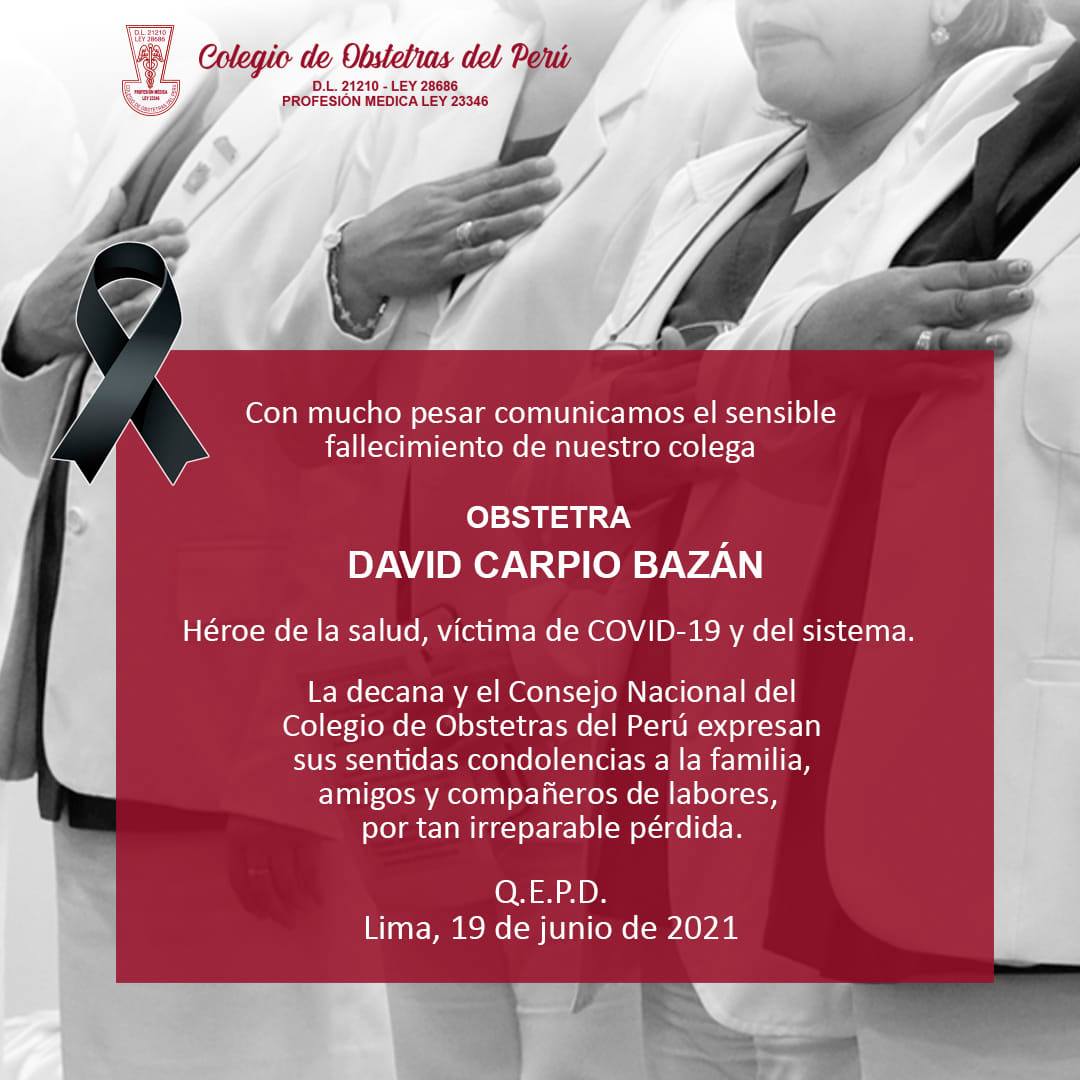Lamentamos comunicar el sensible fallecimiento del obstetra y médico David Carpio Bazán a causa de la COVID-19, en Lima.