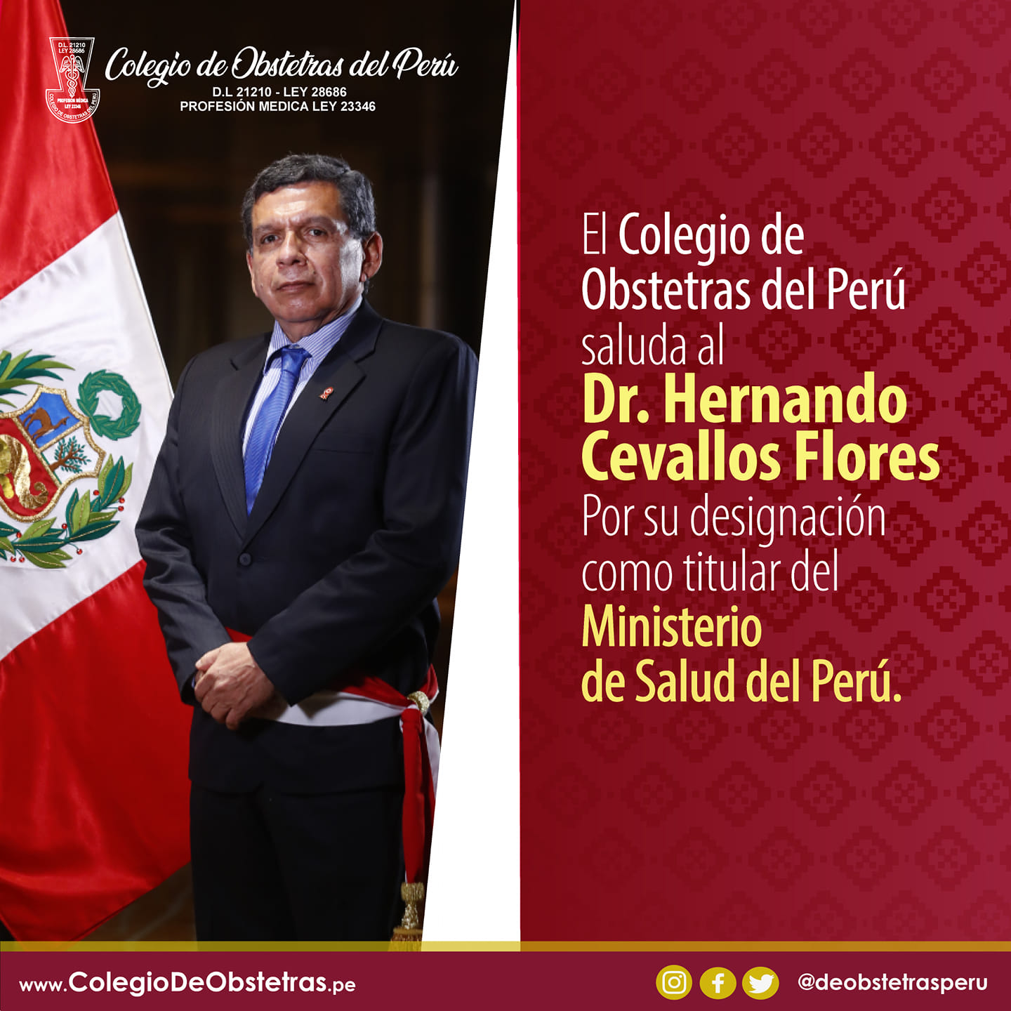 El Colegio de Obstetras del Perú saluda la designación del Dr. Hernando Ismael Cevallos Flores como ministro de Salud.