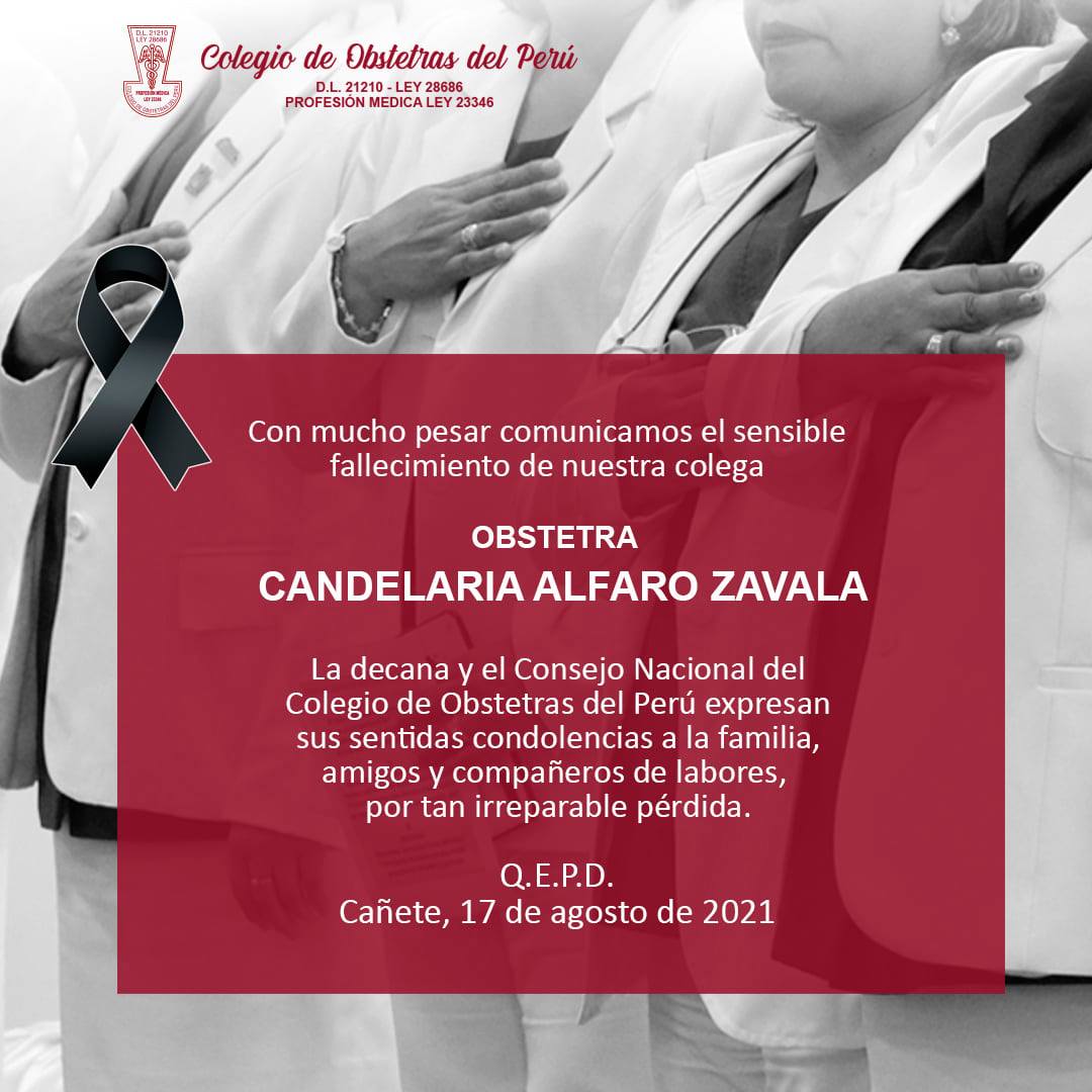 Lamentamos comunicar el sensible fallecimiento de la obstetra Candelaria Alfaro Zavala, quién laboraba en la ciudad de Cañete, en la región Lima.