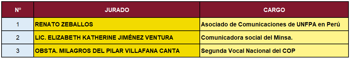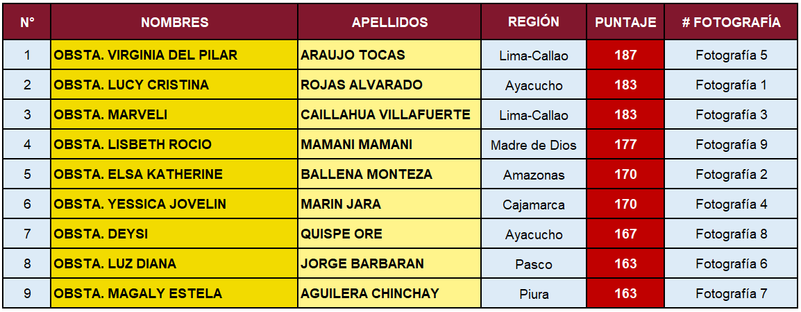 Finalmente, y de acuerdo con el puntaje obtenido, se da como ganadora a la Obsta. Virginia del Pilar Araujo Tocas representante del Colegio Regional de Obstetras III de Lima-Callao con un puntaje de 187. Por tal motivo, se le otorgará una suma de dinero de 200 soles y un diploma por haber ocupado el 1er lugar en el presente concurso.