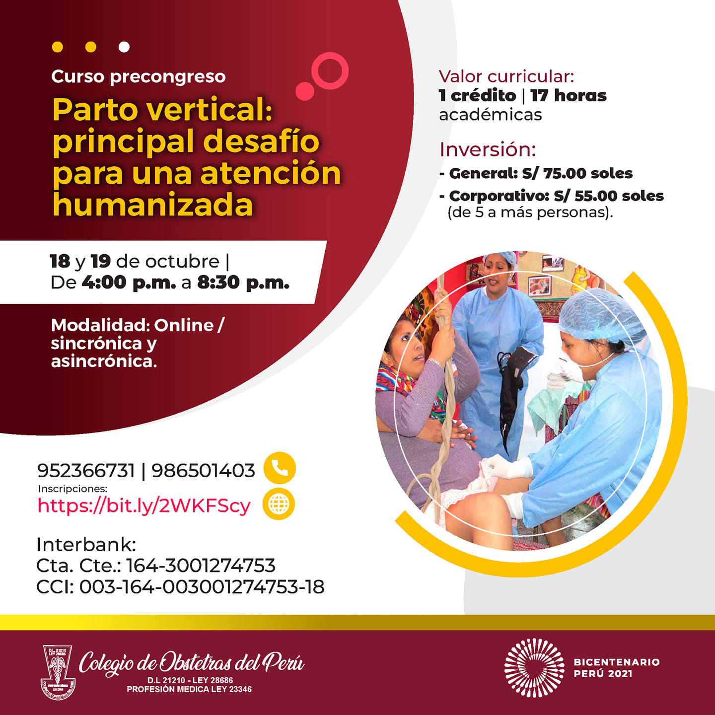 El Colegio de Obstetras del Perú te invita a participar en el curso precongreso «Parto vertical: principal desafío para una atención humanizada».