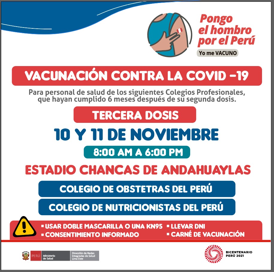El Ministerio de Salud, en coordinación con el Colegio de Obstetras del Perú, ha realizado la programación de la aplicación de la tercera dosis de la vacuna para obstetras de todo Lima Metropolitana y el Callao del sector privado. Si recibieron la segunda dosis hace seis meses, pueden acercarse para la dosis de refuerzo.