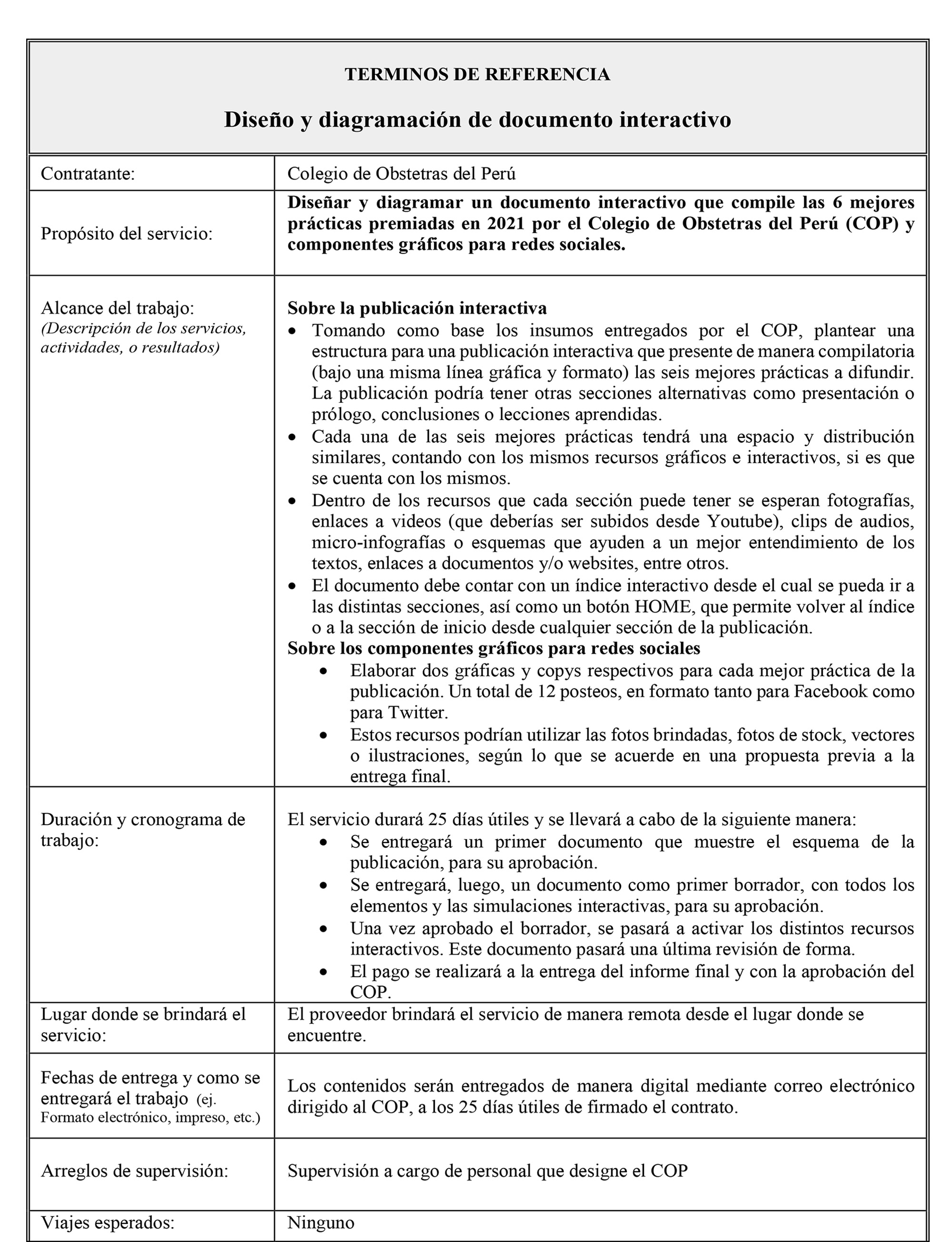 TERMINOS DE REFERENCIA Diseño y diagramación de documento interactivo By Colegio De Obstetras Del PerúIn NoticiasPosted 7 enero, 20220 Comment(s) Descargar Documento Descargar Documento