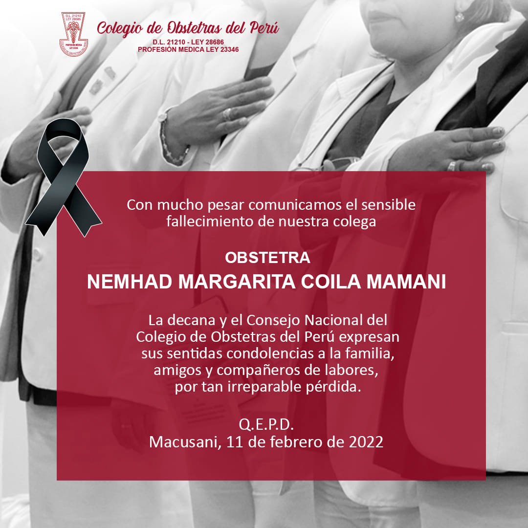 Lamentamos comunicar el sensible fallecimiento de la obstetra Nemhad Margarita Coila Mamani, en Macusani, región Puno.