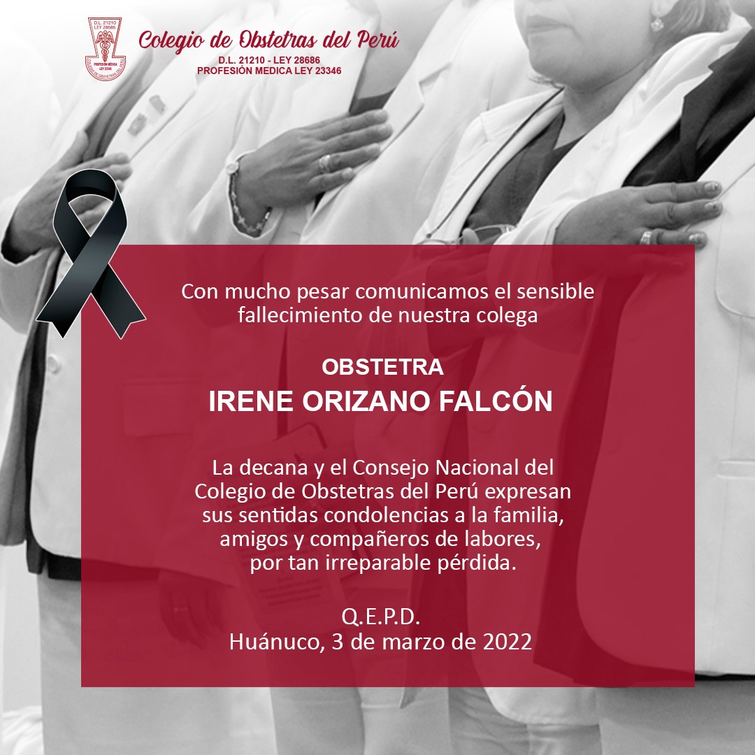 Lamentamos comunicar el sensible fallecimiento de la obstetra Irene Orizano Falcón, en la ciudad Huánuco.