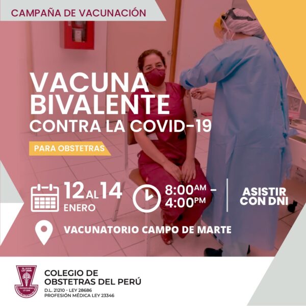 El Colegio de Obstetras del Perú y el Ministerio de Salud invita a todos sus miembros que hayan sido inoculados con la 4ta dosis hace 2 meses o más, a participar de la Campaña de Vacunación, contra la Covid-19 con la Vacuna Bivalente.