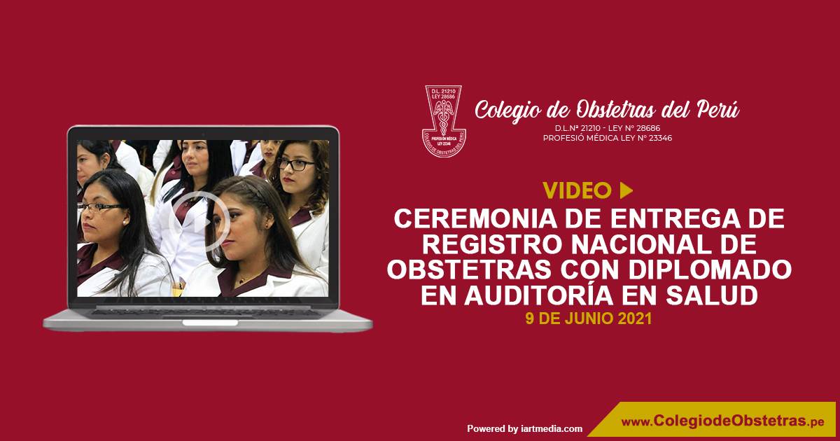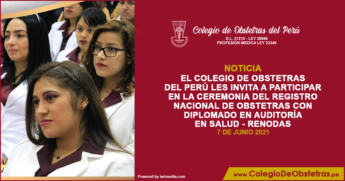 El Colegio de Obstetras del Perú les invita a participar en la ceremonia del Registro Nacional de Obstetras con Diplomado en Auditoría en Salud - Renodas. 9 de junio | 6 p.m.