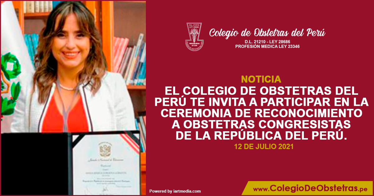 El Colegio de Obstetras del Perú te invita a participar en la ceremonia de reconocimiento a obstetras congresistas de la República del Perú. Jueves, 15 de julio | 6:00 p.m. Te esperamos por Facebook Live