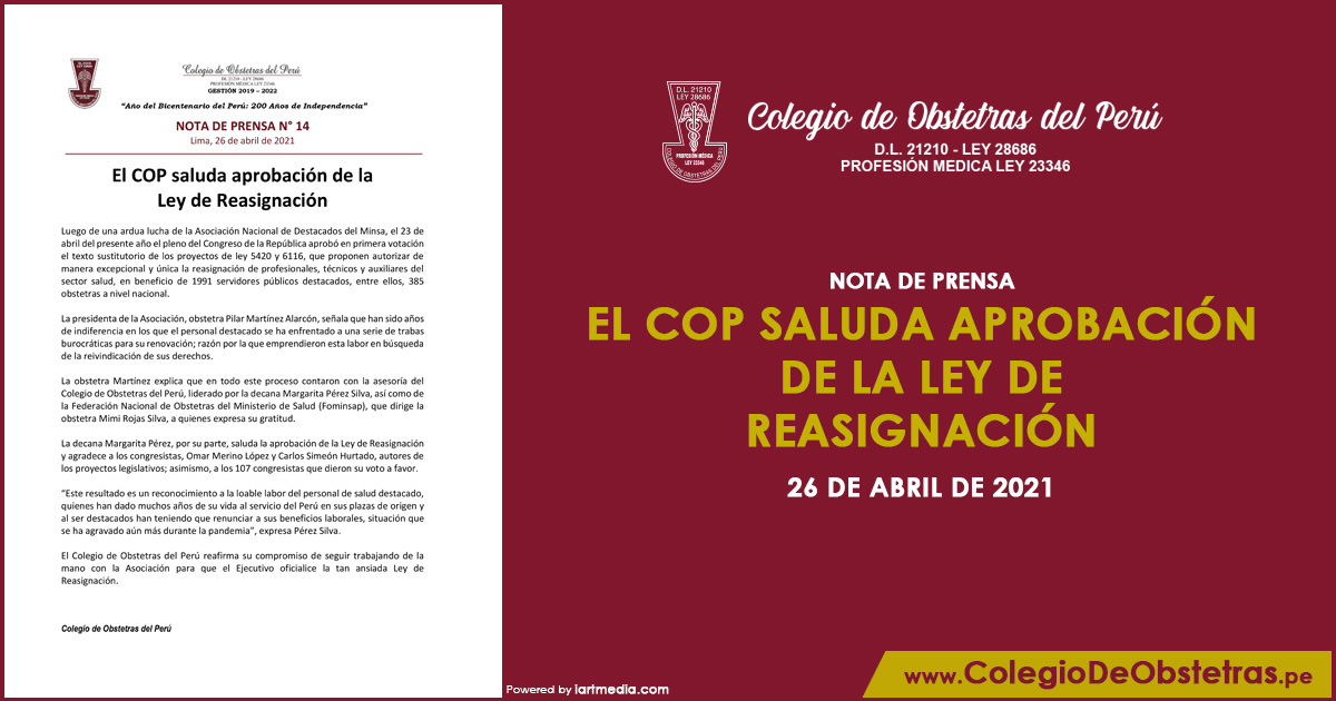 El Colegio de Obstetras del Perú (COP) advierte que el Proyecto de Ley N° 6474, que pretende modificar la Ley de Trabajo del Enfermero N° 27669, es inconstitucional, va en contra de los derechos de obstetras y otros profesionales de salud, y pone en riesgo la salud de la población....