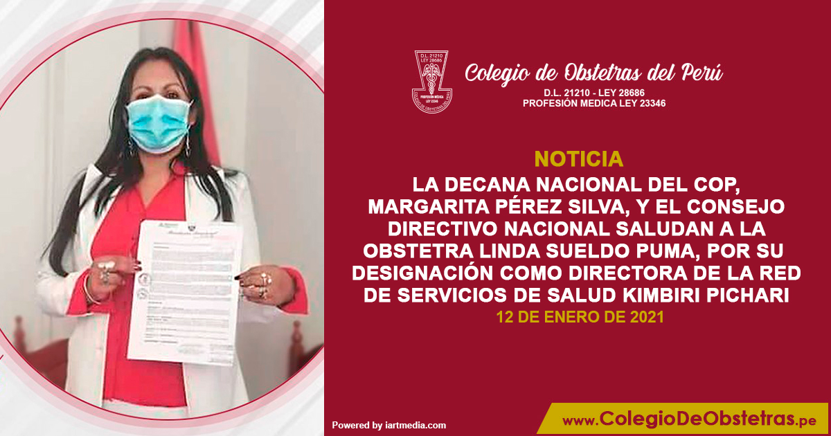 LA DECANA NACIONAL DEL COP, MARGARITA PÉREZ SILVA, Y EL CONSEJO DIRECTIVO NACIONAL SALUDAN A LA OBSTETRA LINDA SUELDO PUMA