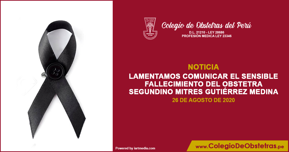 Lamentamos comunicar el sensible fallecimiento del obstetra Segundino Mitres Gutiérrez Medina, a causa de la COVID-19, quien laboraba en el centro de salud "San José de Secce", región Ayacucho. La decana nacional del COP, Margarita Pérez Silva, y el Consejo Nacional expresan sus condolencias a su familia, amigos y...