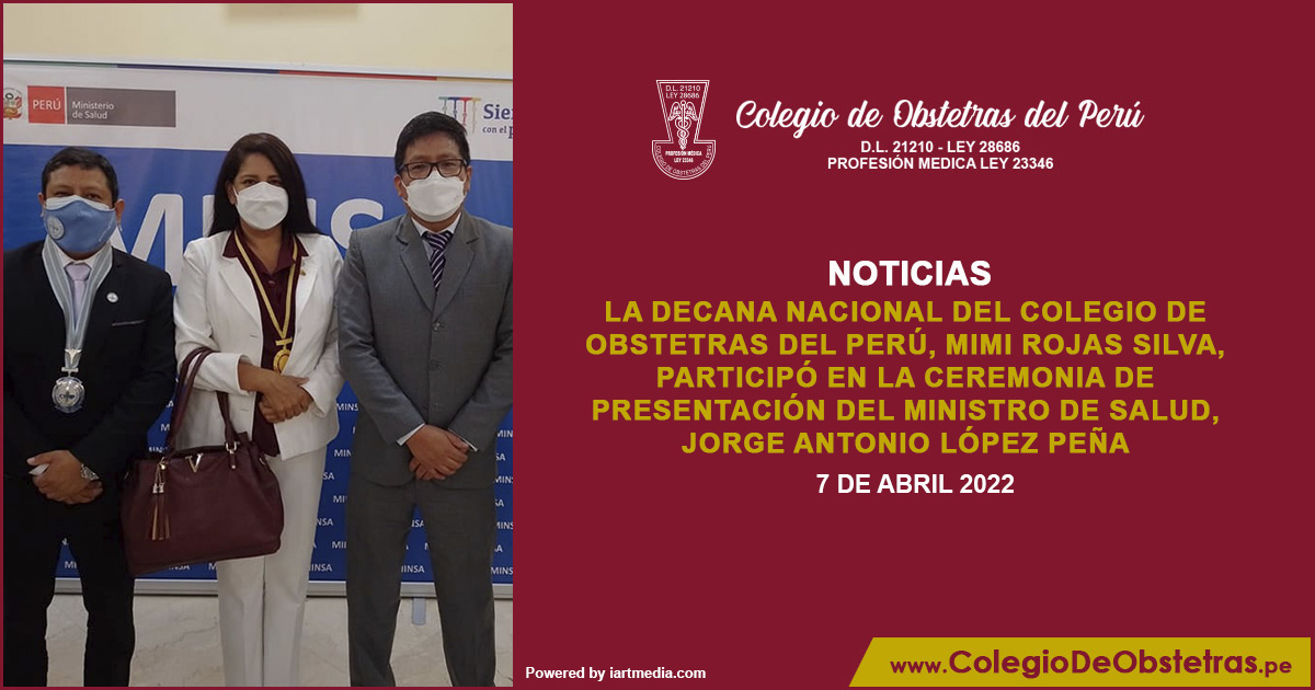 La decana nacional del Colegio de Obstetras del Perú, Mimi Rojas Silva, participó en la ceremonia de presentación del ministro de Salud, Jorge Antonio López Peña, junto a decanos de otros colegios profesionales del sector. La decana instó al ministro a trabajar de manera conjunta con todos los colegios profesionales...