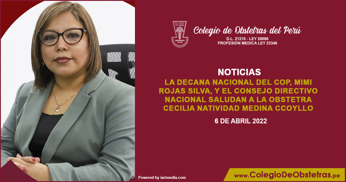 La decana nacional del COP, Mimi Rojas Silva, y el Consejo Directivo Nacional saludan a la obstetra Cecilia Natividad Medina Ccoyllo