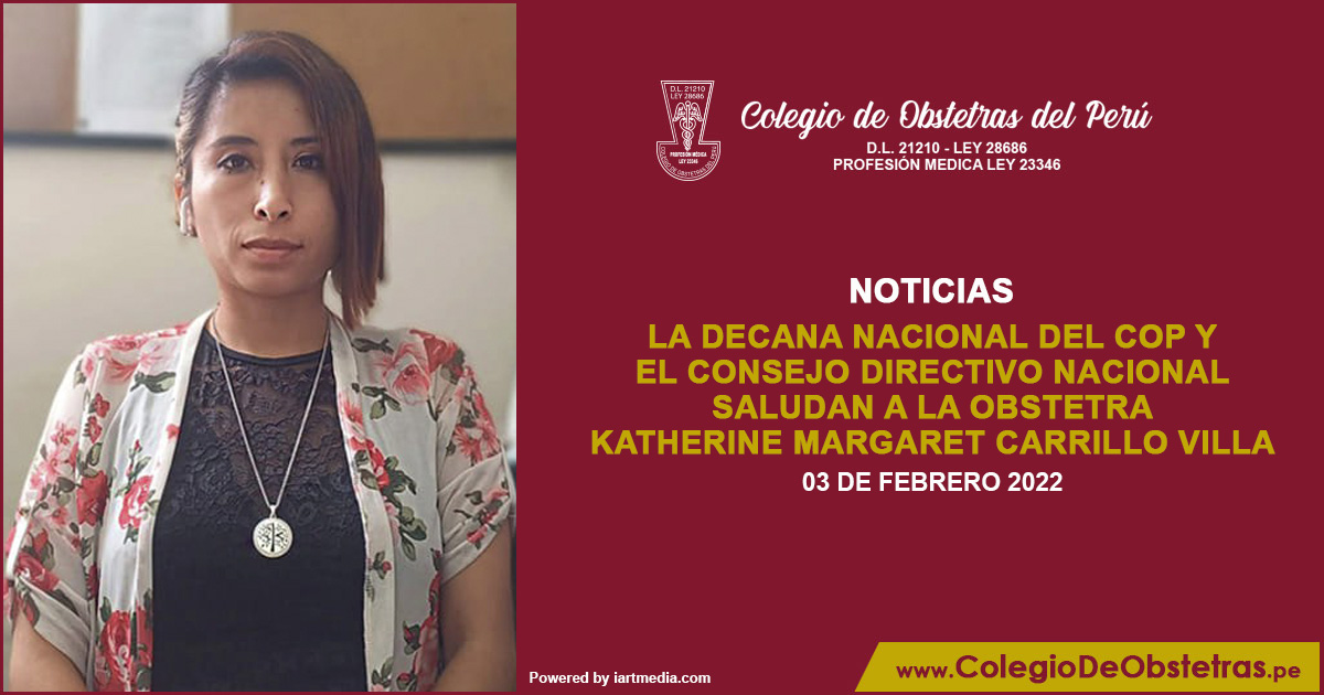 La decana nacional del COP y el Consejo Directivo Nacional saludan a la obstetra Katherine Margaret Carrillo Villa