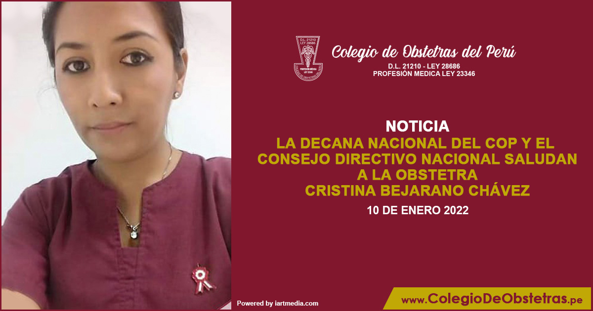 La decana nacional del COP y el Consejo Directivo Nacional saludan a la obstetra Cristina Bejarano Chávez