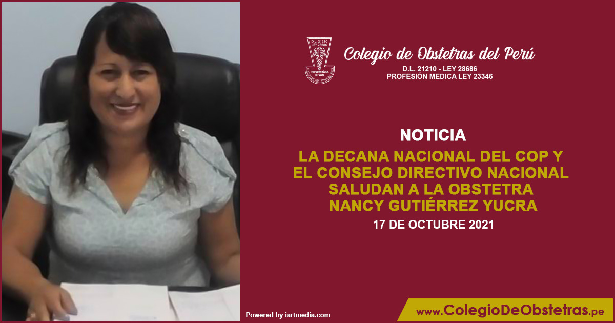 La decana nacional del COP y el Consejo Directivo Nacional saludan a la obstetra Nancy Gutiérrez Yucra