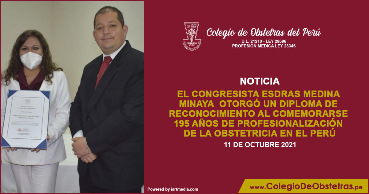 El congresista Esdras Medina Minaya otorgó un diploma de reconocimiento al comemorarse 195 años de profesionalización de la obstetricia en el Perú