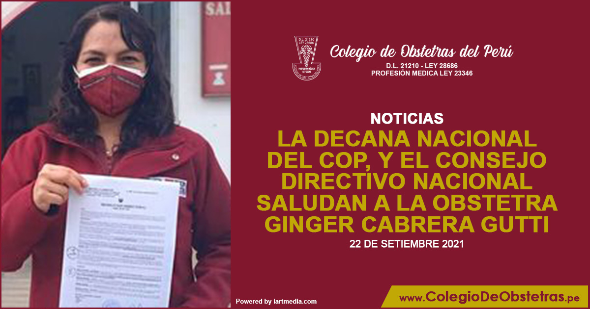 La decana nacional del COP,y el Consejo Directivo Nacional saludan a la obstetra Ginger Cabrera Gutti