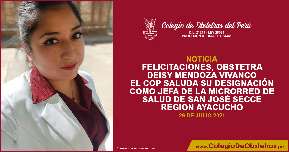 La decana nacional del COP, Margarita Pérez Silva, y el Consejo Directivo Nacional saludan a la obstetra Deisy Pamela Mendoza Vivanco, por su designación como jefa de la Microrred de Salud de San José de Secce, en el distrito Santillana, provincia de Huanta, región Ayacucho. ¡Felicitaciones, obstetra Deisy! ¡Éxitos en...