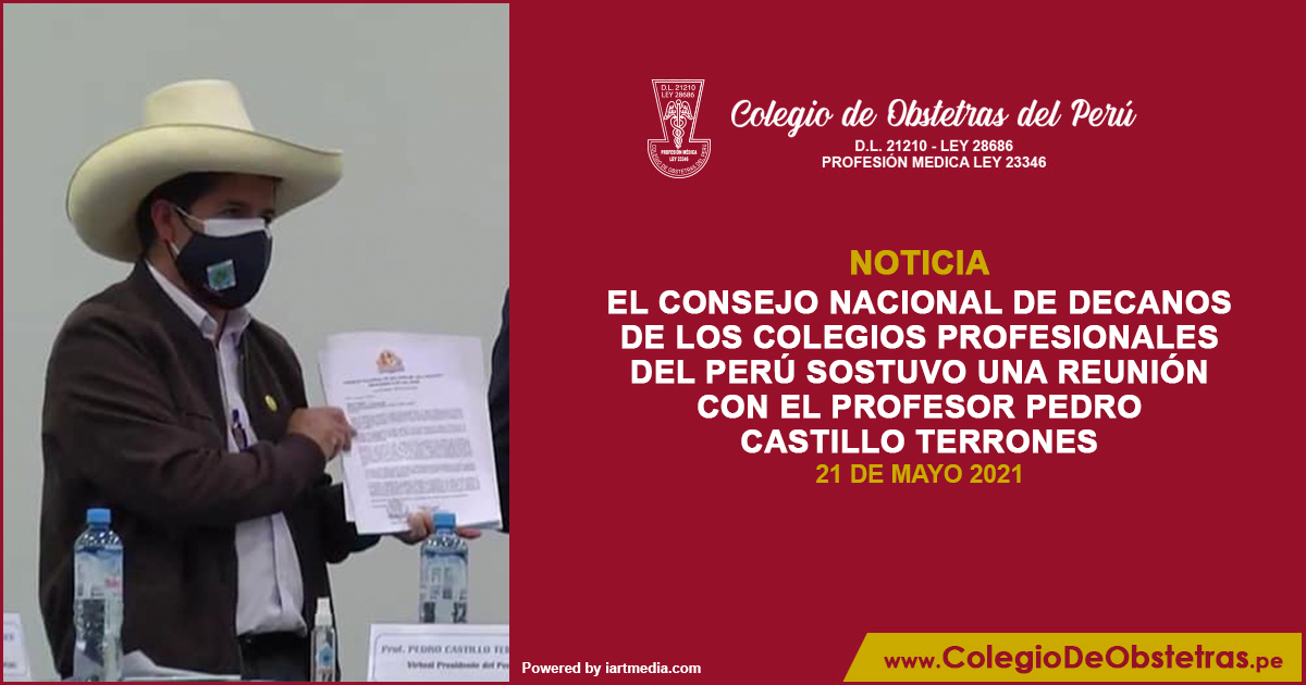El Consejo Nacional de Decanos de los Colegios Profesionales del Perú sostuvo una reunión con el profesor Pedro Castillo Terrones, donde se le entregó un informe multidisciplinario de salud, educación, trabajo y justicia. Conformaron la mesa de honor el decano presidente del CDCP, Vicente Espinoza Santillán; la decana vicepresidenta, Margarita...