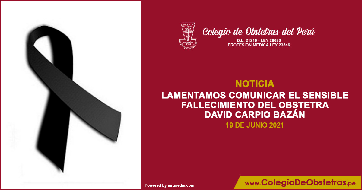 Lamentamos comunicar el sensible fallecimiento del obstetra y médico David Carpio Bazán a causa de la COVID-19, en Lima. La decana nacional del COP, Margarita Pérez Silva, y el Consejo Nacional expresan sus sentidas condolencias a la familia, amigos y compañeros de trabajo. Descansa en paz, estimado David.