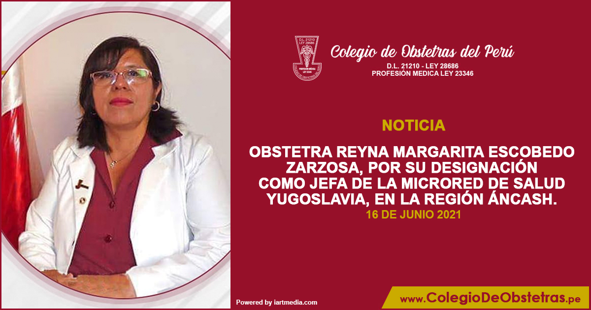 La decana nacional del COP, Margarita Pérez Silva, y el Consejo Directivo Nacional saludan a la obstetra Reyna Margarita Escobedo Zarzosa, por su designación como jefa de la Microred de Salud Yugoslavia, en la región Áncash. ¡Felicitaciones, obstetra Reyna! ¡Éxitos en su gestión!