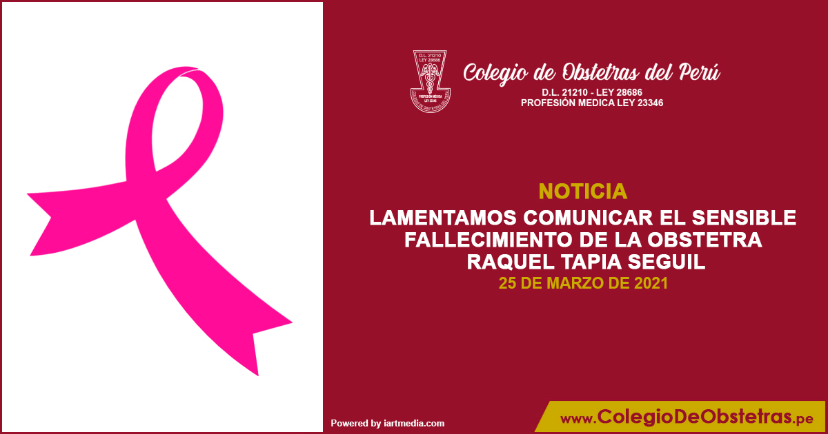 Lamentamos comunicar el sensible fallecimiento de la obstetra Raquel Tapia Seguil, en la región Junín. La decana nacional del COP, Margarita Pérez Silva, y el Consejo Nacional expresan sus sentidas condolencias a la familia, amigos y compañeros de trabajo. Descansa en paz, estimada Raquel.