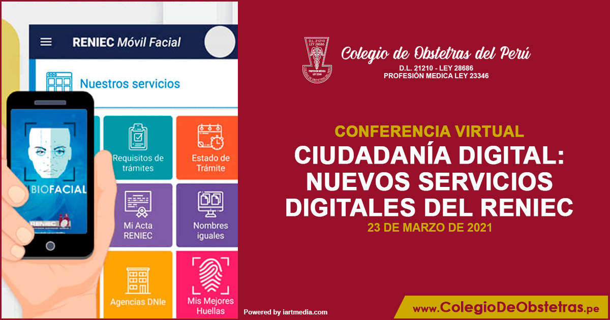 El Colegio de Obstetras del Perú y el Reniec te invitan a participar en la videoconferencia "Ciudadanía digital: nuevos servicios digitales del Reniec", dirigida a obstetras. Inscríbete en: https://bit.ly/3bXxyLt *Cupos limitados. Miércoles, 24 de marzo 3:00 p.m. ¡Te esperamos!