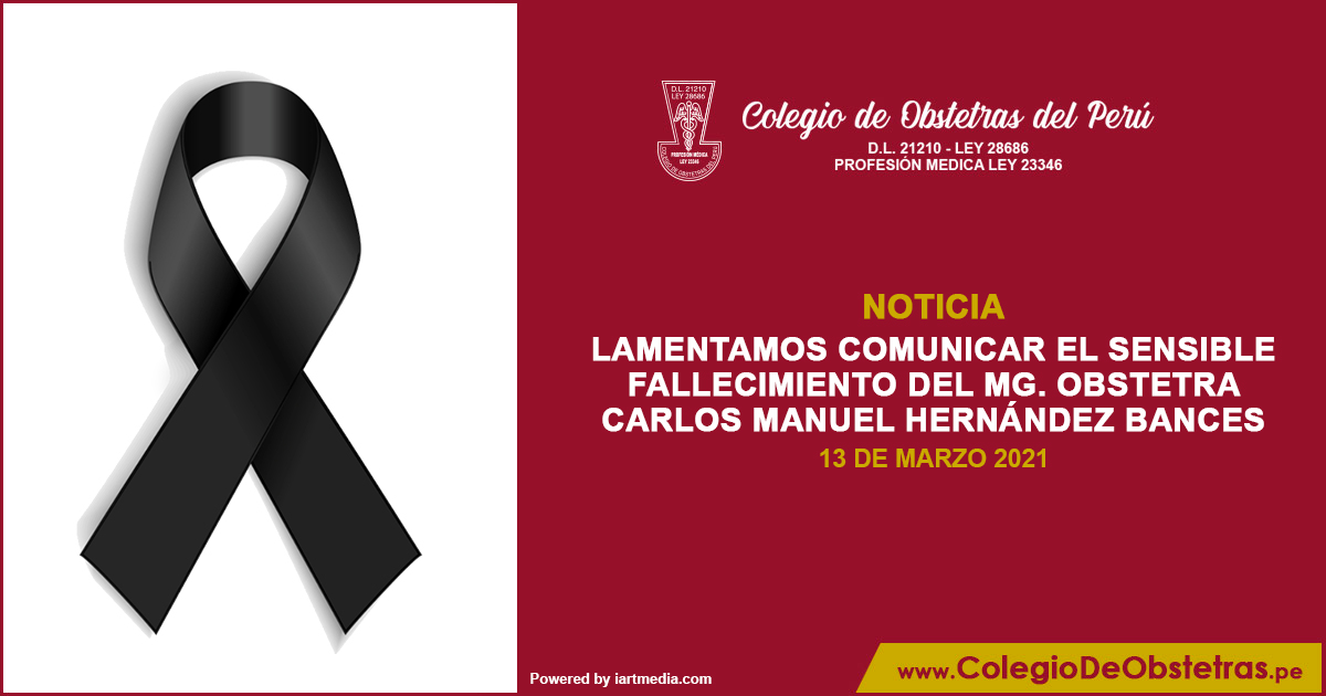 Lamentamos comunicar el sensible fallecimiento del obstetra Carlos Manuel Hernández Bances, víctima de la COVID-19 en la ciudad de Chepén, La Libertad. La decana nacional del COP, Margarita Pérez Silva, y el Consejo Nacional expresan sus sentidas condolencias a la familia, amigos y compañeros de trabajo. Descansa en paz,...