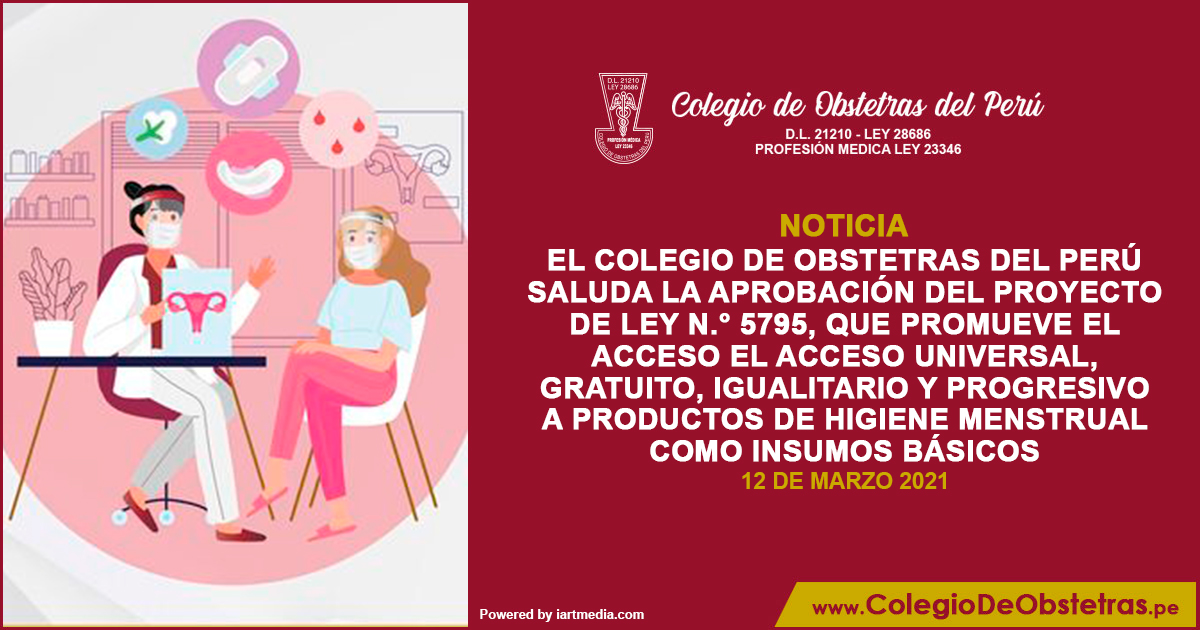 El Colegio de Obstetras del Perú saluda la aprobación del proyecto de Ley N.° 5795, que promueve el acceso el acceso universal, gratuito, igualitario y progresivo a productos de higiene menstrual como insumos básicos. Iniciativa de la congresista Arlette Contreras.