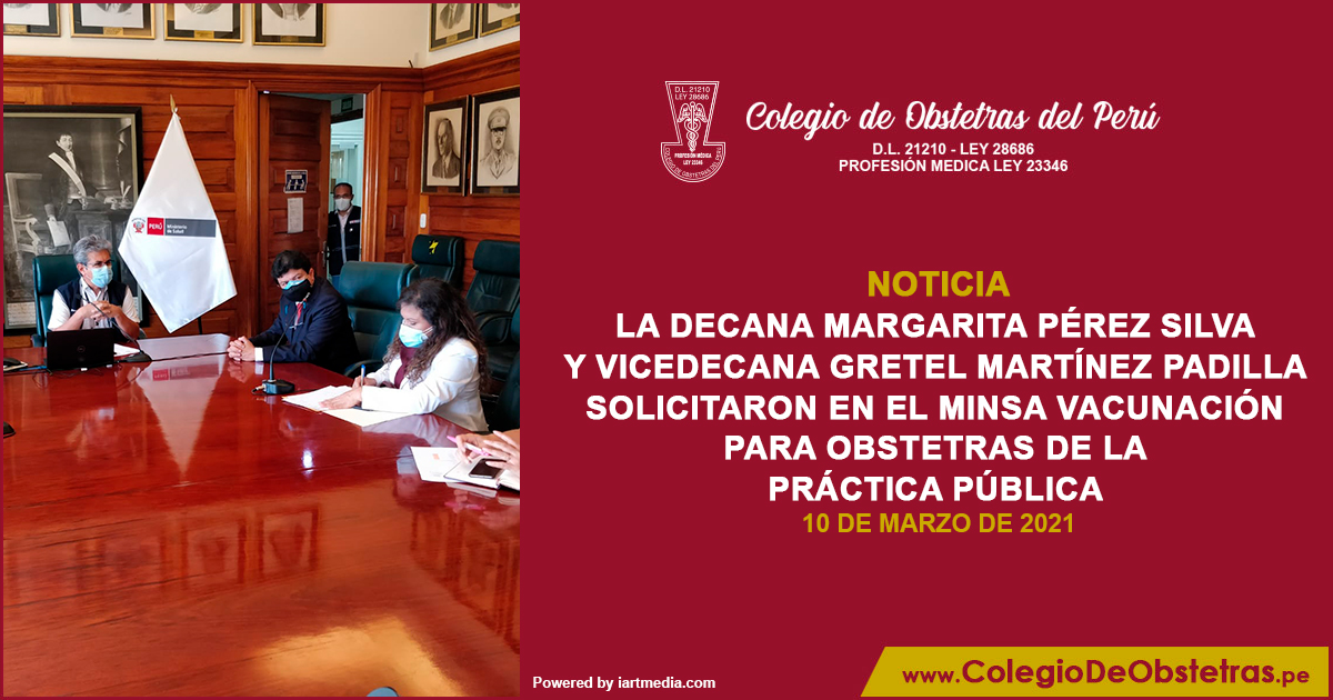 La decana Margarita Pérez Silva y vicedecana Gretel Martínez Padilla solicitaron en el Minsa vacunación para obstetras de la práctica pública, privada y mayores de 60 años en la primera fase. Esta demanda lo realizaron ayer en la reunión con el viceministro de Salud Pública, Percy Minaya, en la...