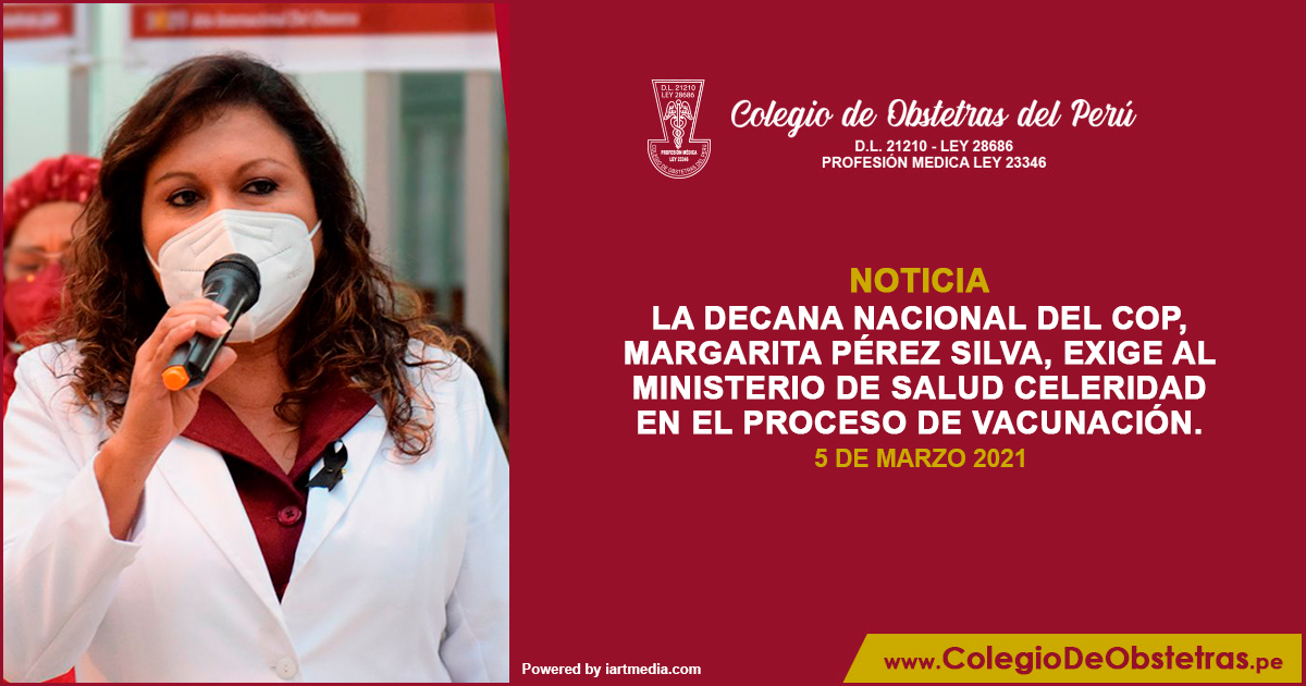 La decana nacional del COP, Margarita Pérez Silva, exige al Ministerio de Salud celeridad en el proceso de vacunación. Es necesario que el Estado garantice la vacunación para todos los profesionales de la salud del sector público y privado, que están en la primera lucha de atención.