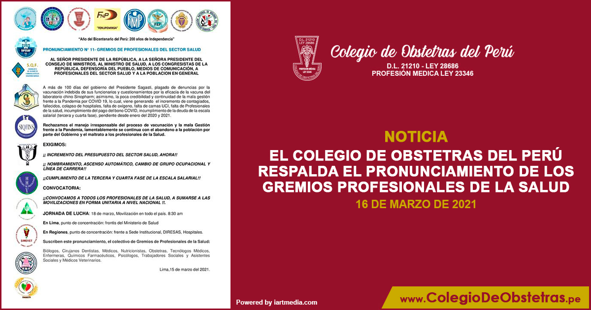 El Colegio de Obstetras del Perú respalda el pronunciamiento de los gremios profesionales de la salud