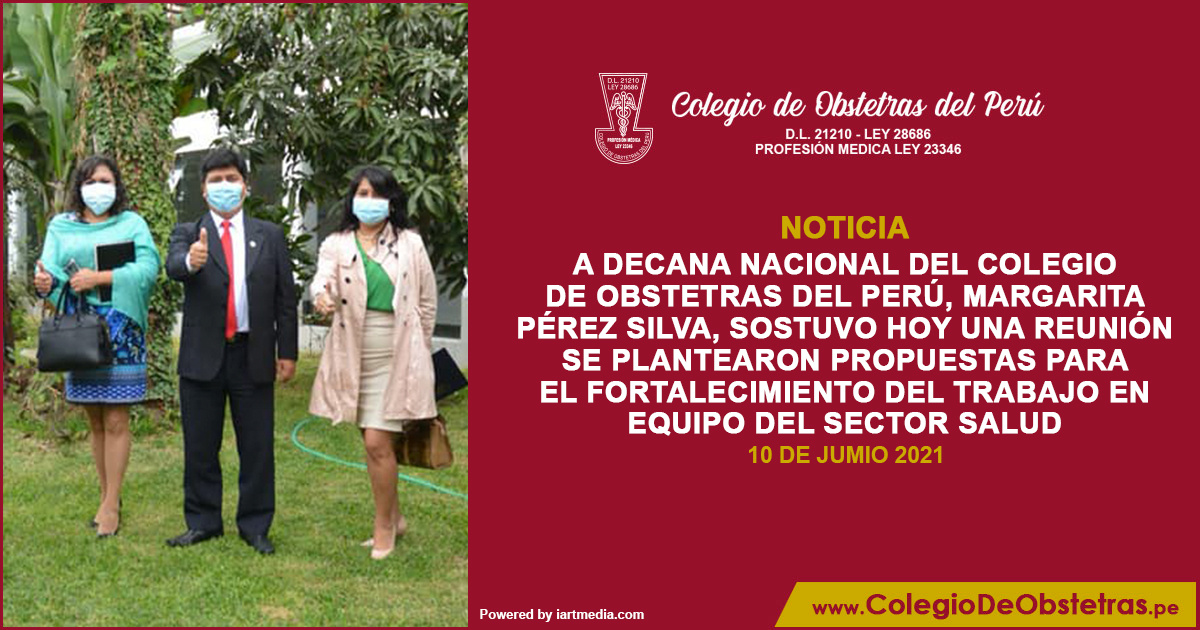 La decana nacional del Colegio de Obstetras del Perú, Margarita Pérez Silva, sostuvo hoy una reunión con el decano del Colegio Químico Farmacéutico del Perú, Mario Carhuapoma Yance; el decano del Colegio Tecnólogo Médico del Perú, Carlos Sánchez Rafael; la decana del Colegio de Biólogos del Perú, Gardenia Jiménez Villavicencio,...