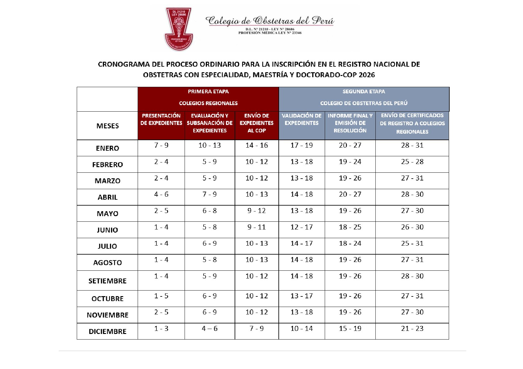 - Ante alguna necesidad particular justificada de registro fuera del cronograma establecido, el colegiado deberá presentar solicitud para “proceso extraordinario de registro de especialidad”, al cual se aplicarán los ajustes tarifarios correspondientes realizados en la sede del Colegio de Obstetras del Perú.